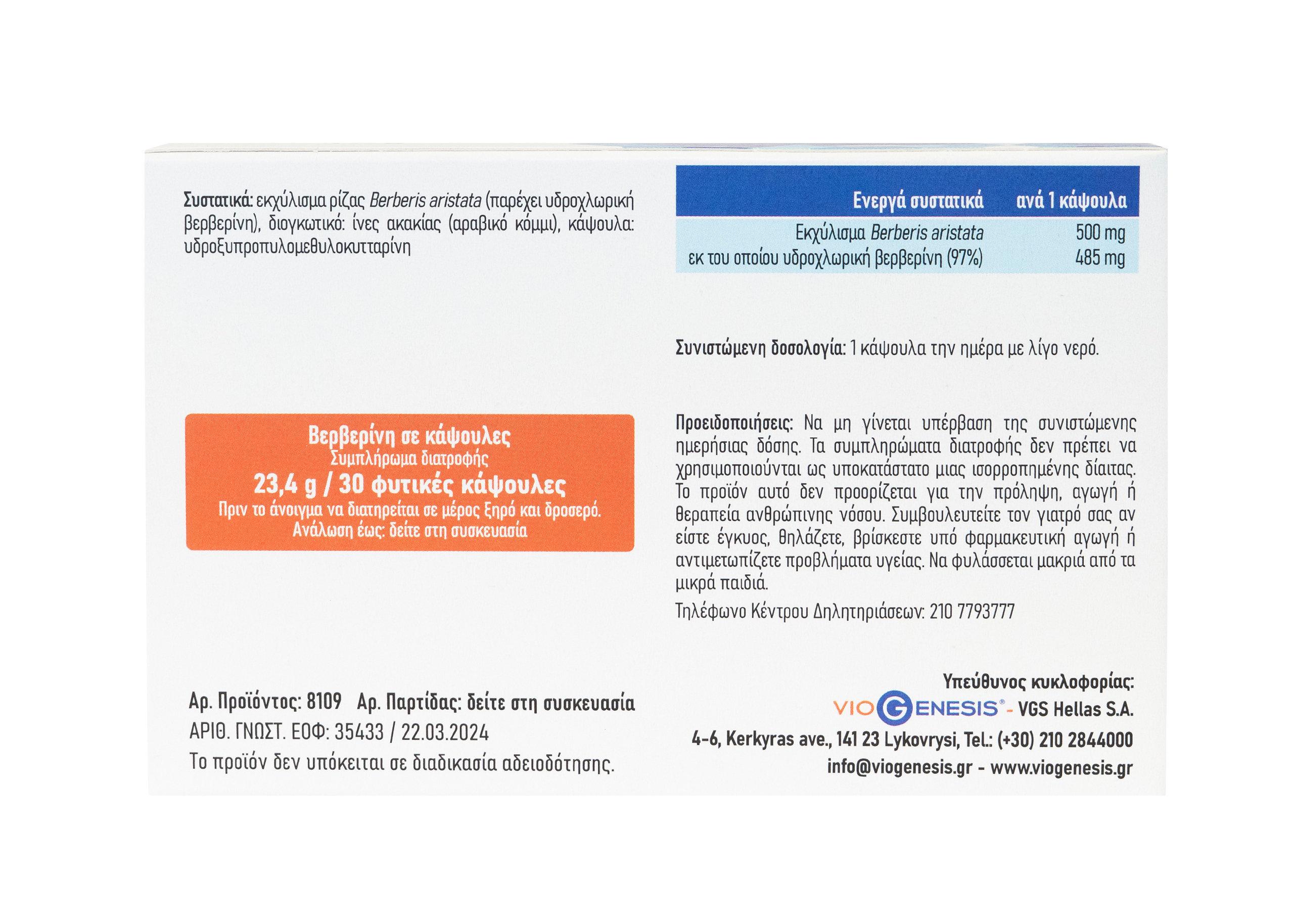 VioGenesis Berberine 30 caps box cells back