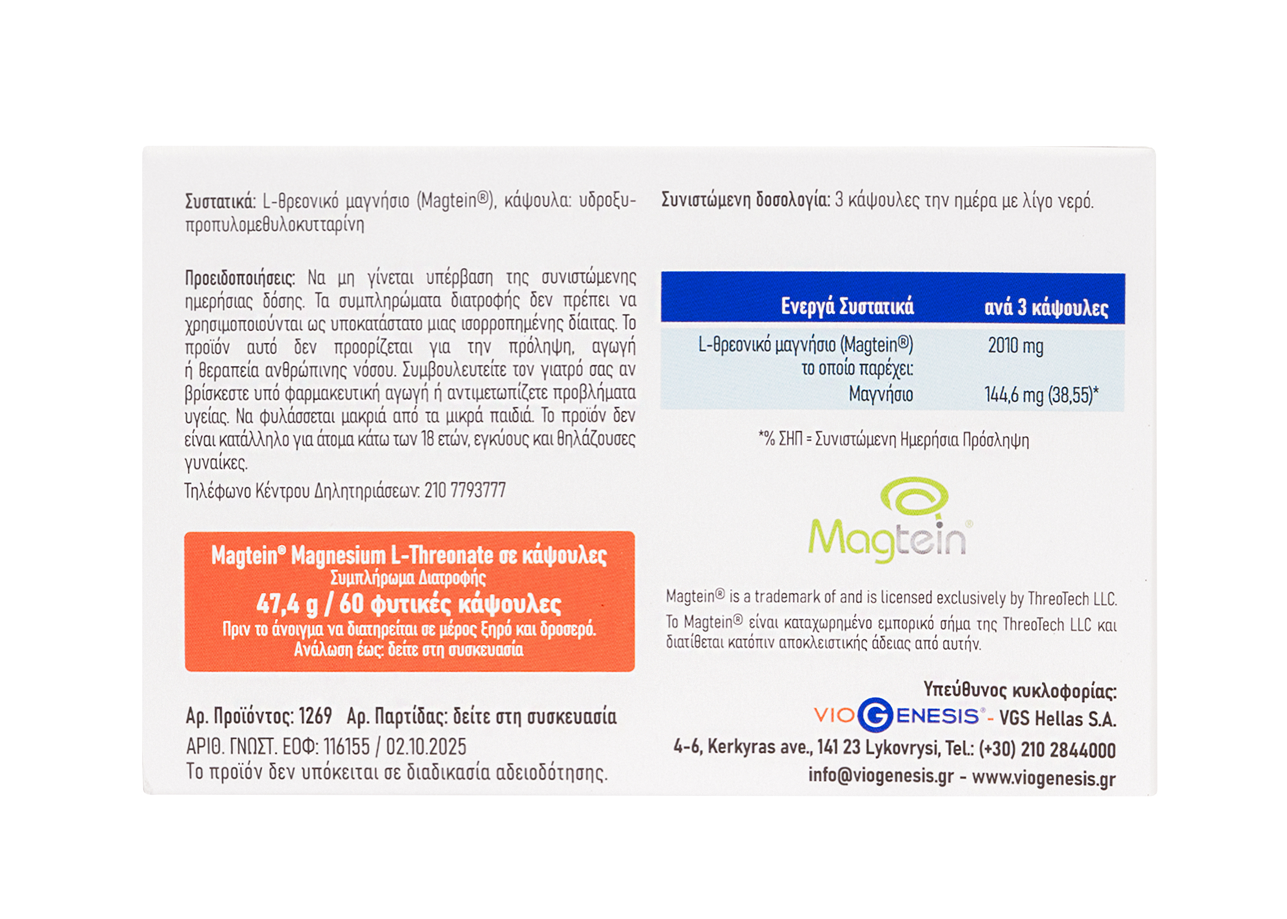 VioGenesis Magtein Magnesium L – Threonate 60 caps box cells back
