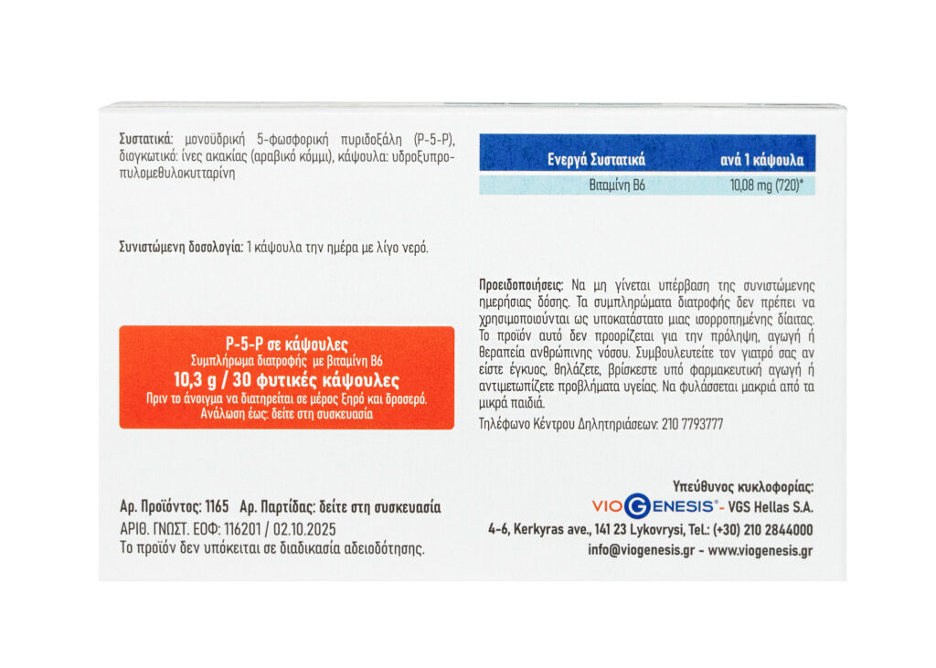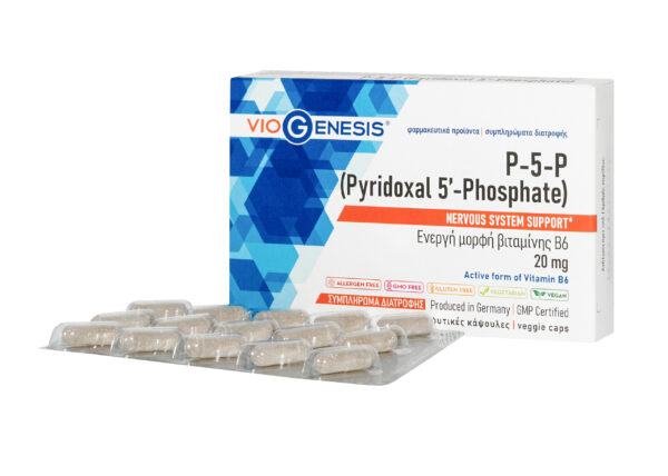 Το VioGenesis P-5-P (Pyridoxal 5′-Phosphate) αποτελεί ένα συμπλήρωμα διατροφής που περιέχει βιταμίνη Β6 ως 5′-φωσφορική πυριδοξάλη. Η βιταμίνη Β6 προσλαμβάνεται μέσω της διατροφής (π.χ. από κρέας, ψάρια ή ξηρούς καρπούς) και μετατρέπεται στον οργανισμό στην ενεργή μορφή της, την 5’-φωσφορική πυριδοξάλη (P-5-P). Η P-5-P συμμετέχει σε περισσότερες από 100 ζωτικές βιοχημικές διεργασίες, κυρίως στον μεταβολισμό αμινοξέων, στη σύνθεση νευροδιαβιβαστών κ.ά.