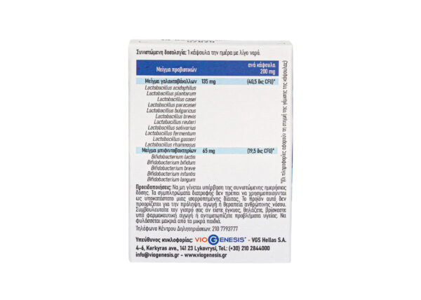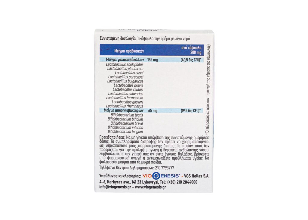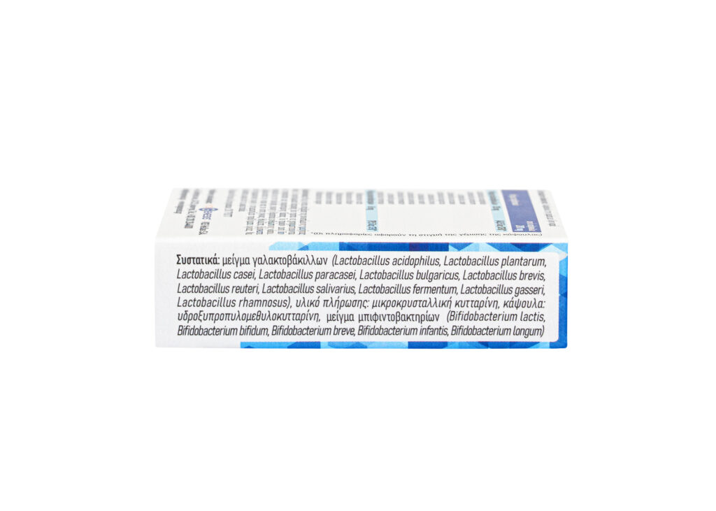 Ingredients: Probiotic Mix Lacto (Lactobacillus acidophilus, Lactobacillus plantarum, Lactobacillus casei, Lactobacillus paracasei, Lactobacillus bulgaricus, Lactobacillus brevis, Lactobacillus reuteri, Lactobacillus salivarius, Lactobacillus fermentum, Lactobacillus gasseri, Lactobacillus rhamnosus), Probiotic Mix Bifido (Bifidobacterium lactis, Bifidobacterium bifidum, Bifidobacterium breve, Bifidobacterium infantis, Bifidobacterium longum)