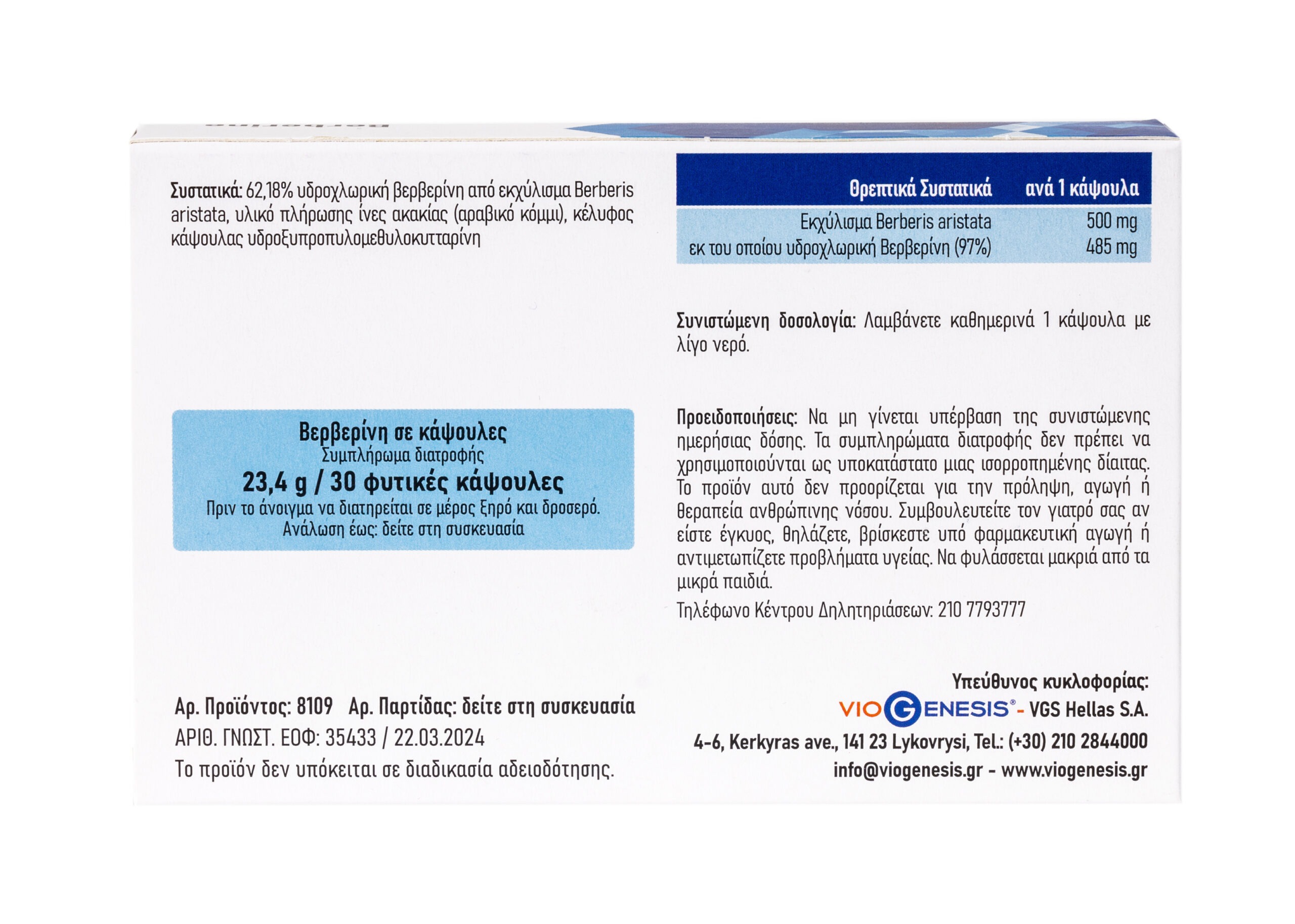 VioGenesis Berberine 30 caps box cells back
