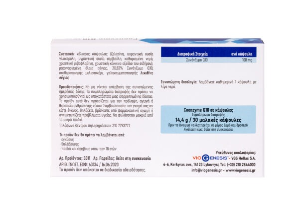 Το VioGenesis Coenzyme Q10 100 mg περιέχει μία πλήρως αφομoιώσιμη μορφή ουμπικινόνης ή συνένζυμου Q10. Το συνένζυμο Q10 έχει ισχυρές αντιοξειδωτικές ιδιότητες, καθώς δεσµεύει τις ελεύθερες ρίζες.*
