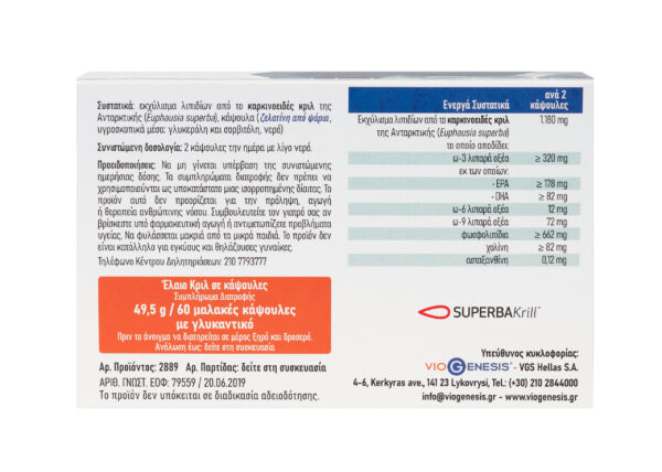 Το VioGenesis Krill Oil περιέχει το υψηλής ποιότητας SuperbaKRILL™, ένα πατενταρισμένο εκχύλισμα λιπιδίων από το καρκινοειδές κριλ της Ανταρκτικής (Euphausia superba). Τα κριλ είναι μικρά καρκινοειδή που μοιάζουν με γαρίδες.