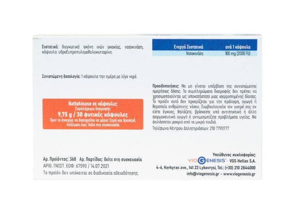To VioGenesis Nattokinase περιέχει το ένζυμο νατοκινάση. Το εκχύλισμα σόγιας που έχει υποστεί ζύμωση περιέχει νατοκινάση απομονωμένη από το νατό, ένα προϊόν διατροφής που παράγεται από τη ζύμωση μη γενετικώς τροποποιημένης σόγιας (Glycine max L.) με επιλεγμένο στέλεχος του Bacillus subtilis var. natto.