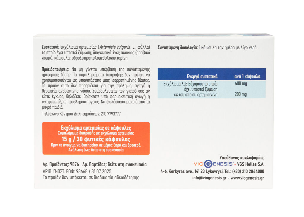 To συμπλήρωμα διατροφής VioGenesis Artemisia περιέχει αρτεμισία (Artemisia vulgaris L.) η οποία έχει υποστεί ζύμωση και αποδίδει σε ποσοστό 50% αρτεμισινίνη.