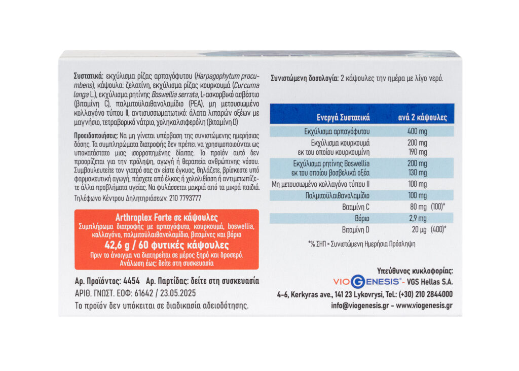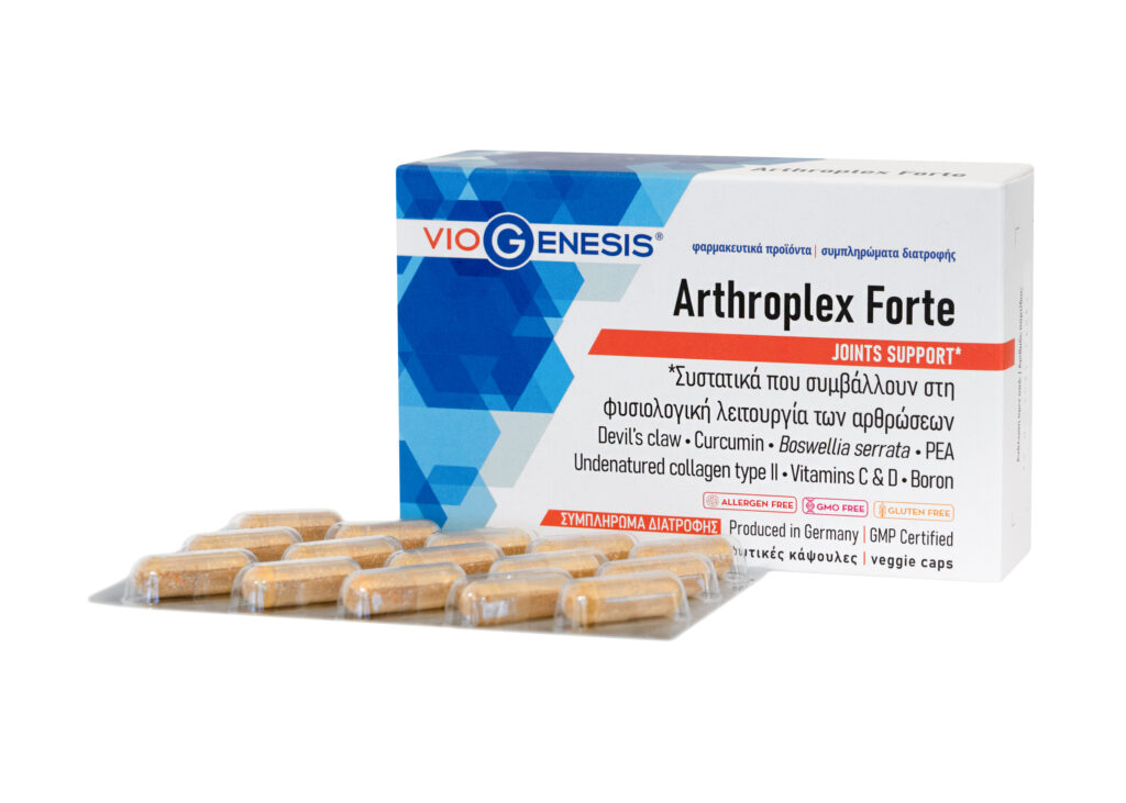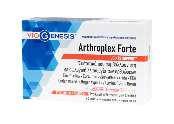 Το VioGenesis Arthroplex Forte είναι μια ολοκληρωμένη φόρμουλα με συστατικά πολλαπλών δράσεων, που συμβάλλουν αποτελεσματικά στη φυσιολογική λειτουργία και τη διατήρηση της κινητικότητας των αρθρώσεων. Πιο συγκεκριμένα περιέχει: