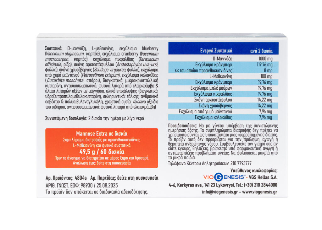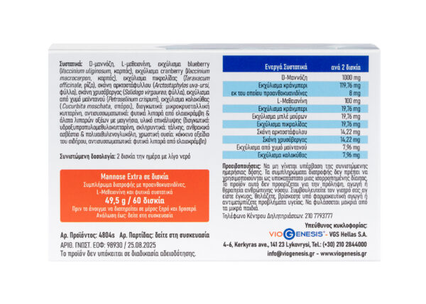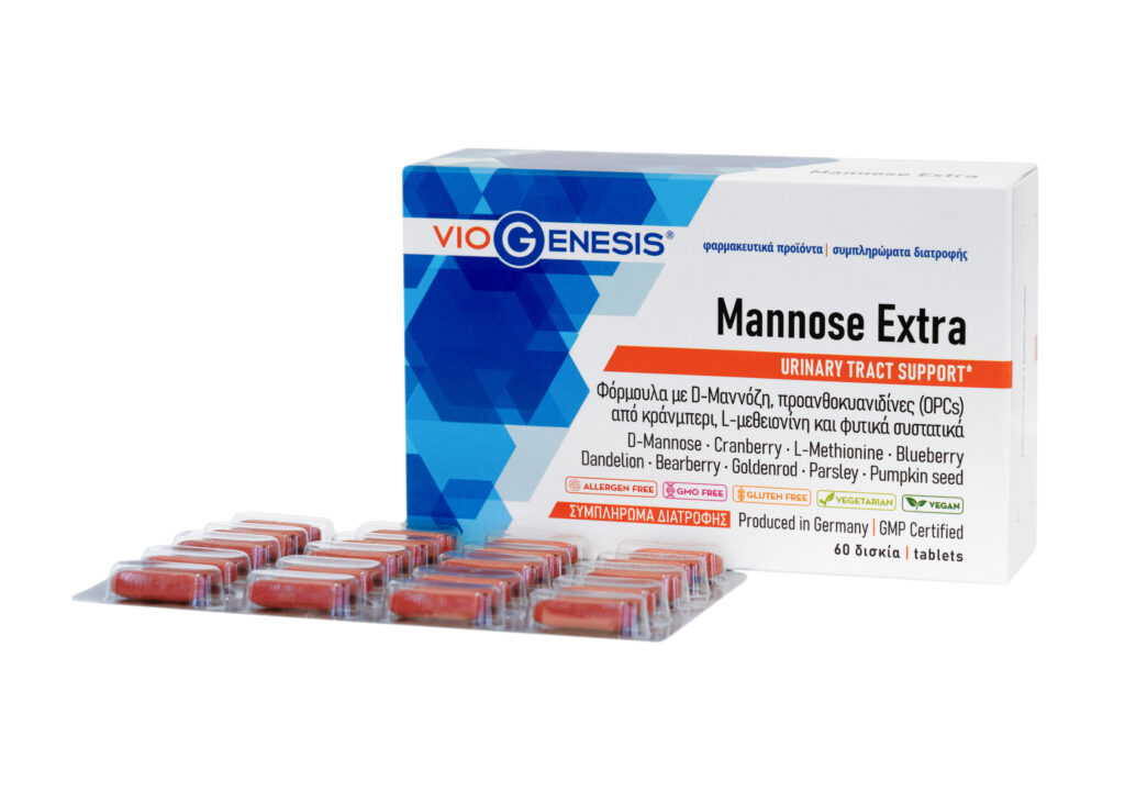 To VioGenesis Mannose Extra είναι μια φόρμουλα με D-μαννόζη, προανθοκυανιδίνες (OPCs) από κράνμπερι, L-μεθειονίνη και φυτικά συστατικά. Χάρη στη σύνθεσή του, το VioGenesis Mannose Extra συμβάλλει στη διατήρηση της φυσιολογικής λειτουργίας του κατώτερου ουροποιητικού συστήματος και υποστηρίζει τη λειτουργία της ουροδόχου κύστης. Πιο συγκεκριμένα το προϊόν περιέχει: