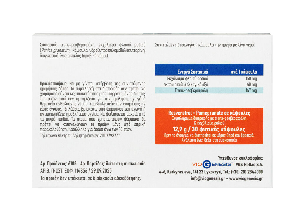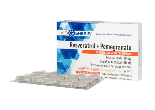 Το VioGenesis Resveratrol + Pomegranate είναι ένα συμπλήρωμα διατροφής το οποίο συνδυάζει trans-ρεσβερατρόλη και εκχύλισμα φλοιού ροδιού. Χάρη στη σύνθεσή του, συμβάλλει στη φυσιολογική λειτουργία του καρδιαγγειακού συστήματος και προσφέρει αντιοξειδωτικές ιδιότητες. Πιο συγκεκριμένα: