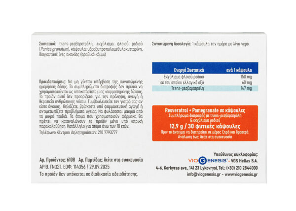 Βασικά συστατικά: trans-ρεσβερατρόλη, εκχύλισμα φλοιού ροδιού (Punica granatum L.)