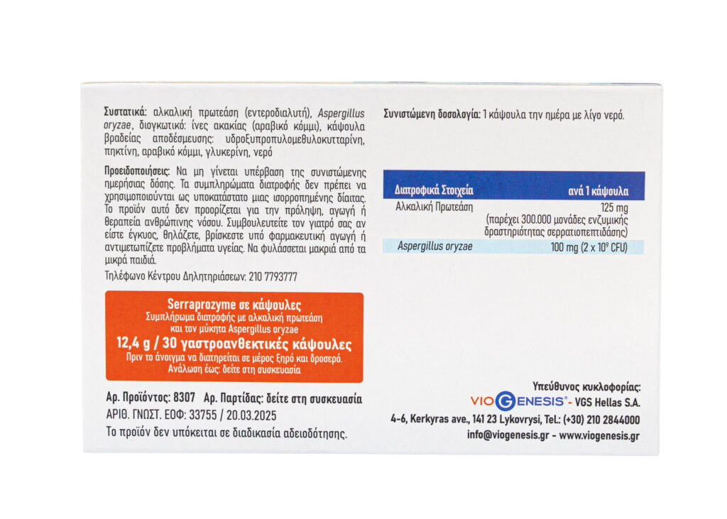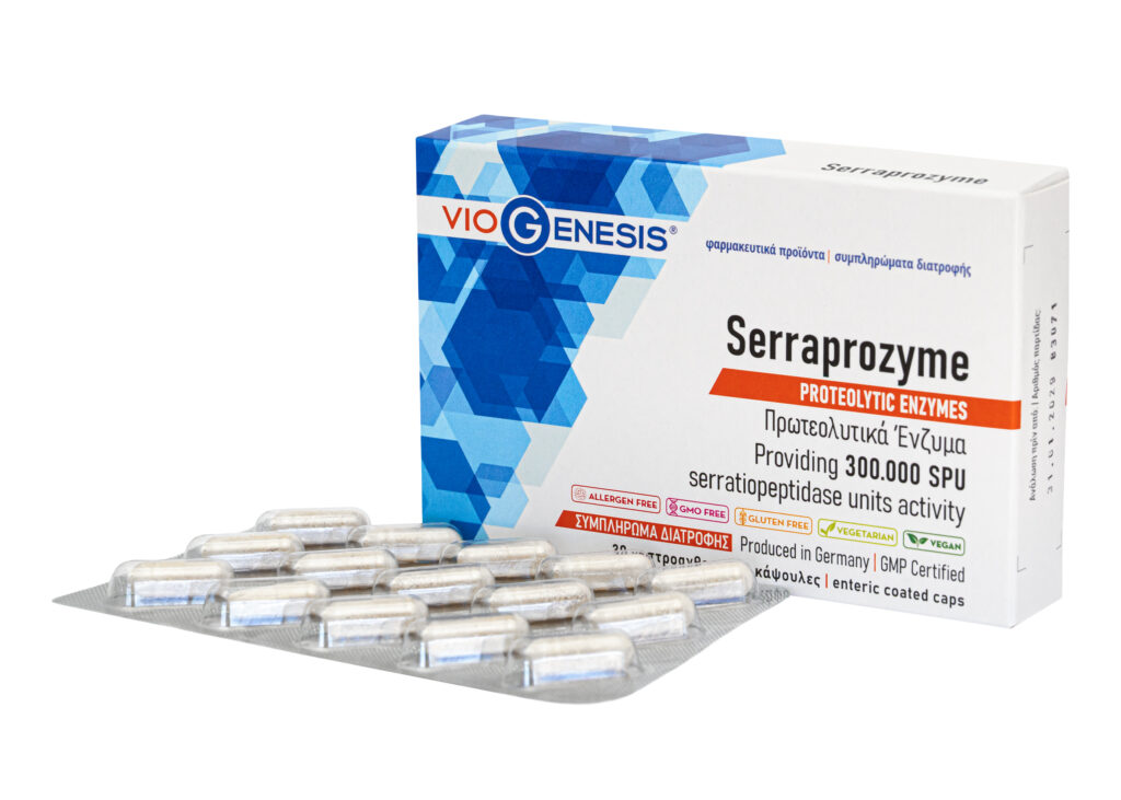 Το VioGenesis Serraprozyme είναι ένα συμπλήρωμα διατροφής το οποίο περιέχει το πρωτεολυτικό ένζυμο αλκαλική πρωτεάση και το μύκητα Aspergillus oryzae.